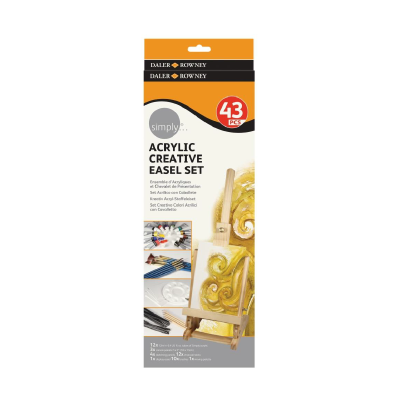 Este Set Creativo contiene todo lo necesario: 1 caballete de mesa, 12 tubos de acrílico, 10 pinceles, 1 paleta mezcladora, 3 cartones entelados, 4 lápices para bocetar, 12 carbonillas. Ideal para regalar.