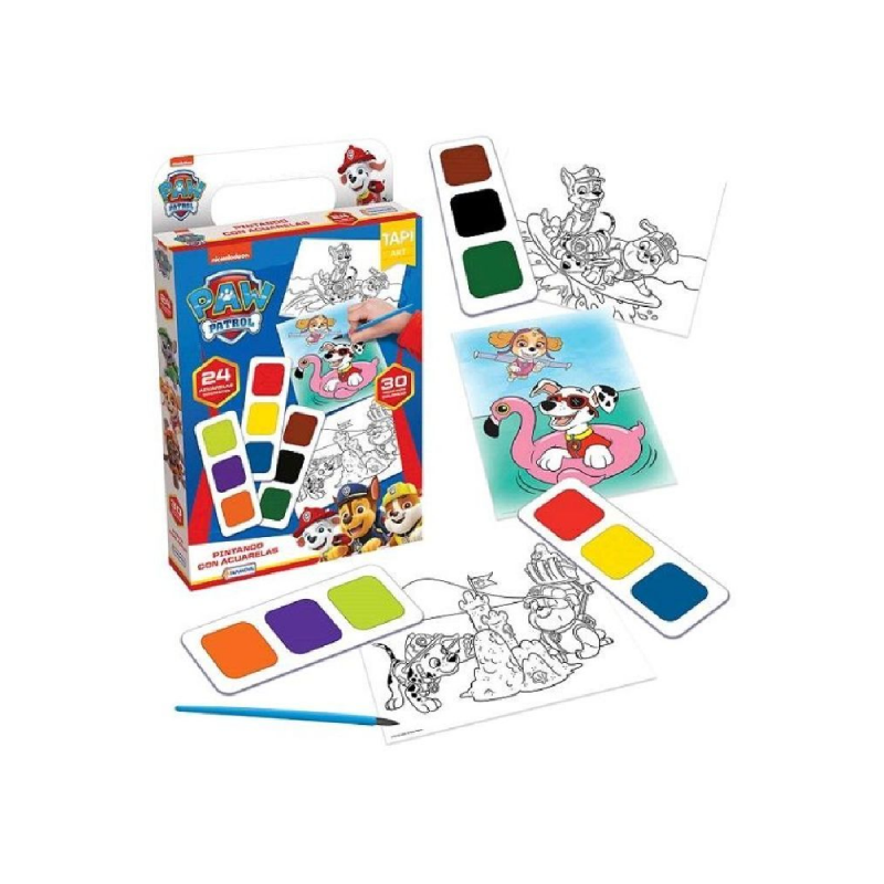 Incluye: 30 hojas para colorear con los personajes de Paw Patrol , 24 colores de acuarelas y 1 pincel