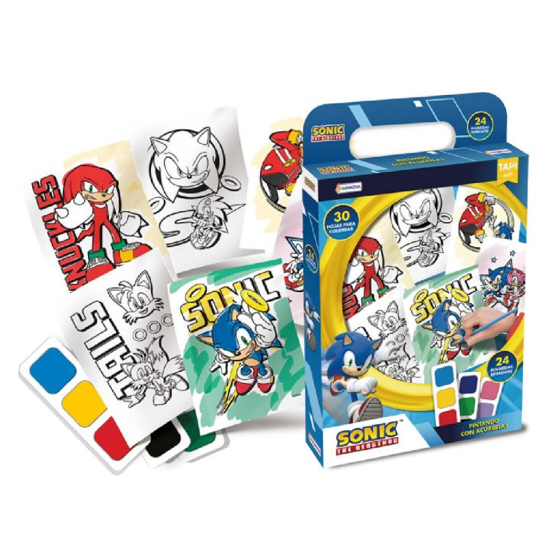 Incluye: 30 hojas para colorear con los personajes de Sonic , 24 colores de acuarelas y 1 pincel