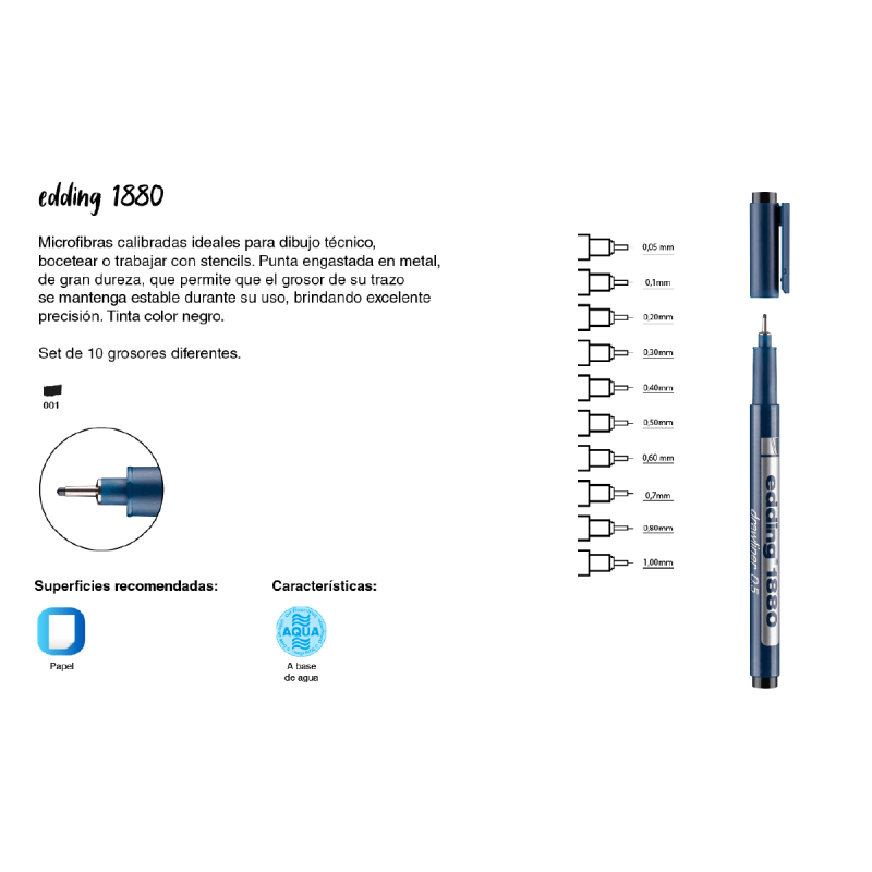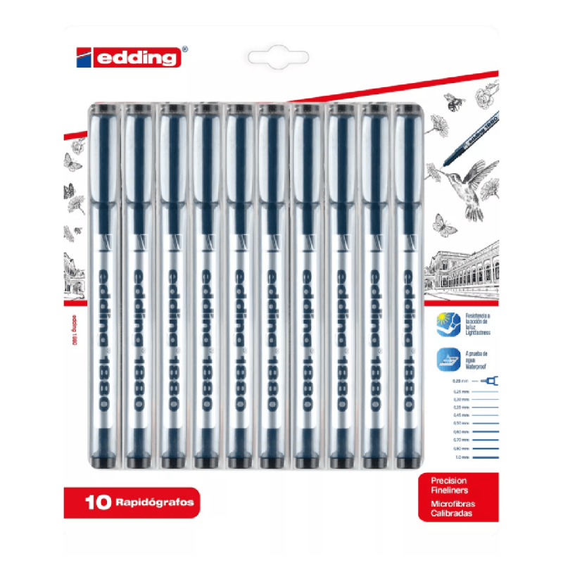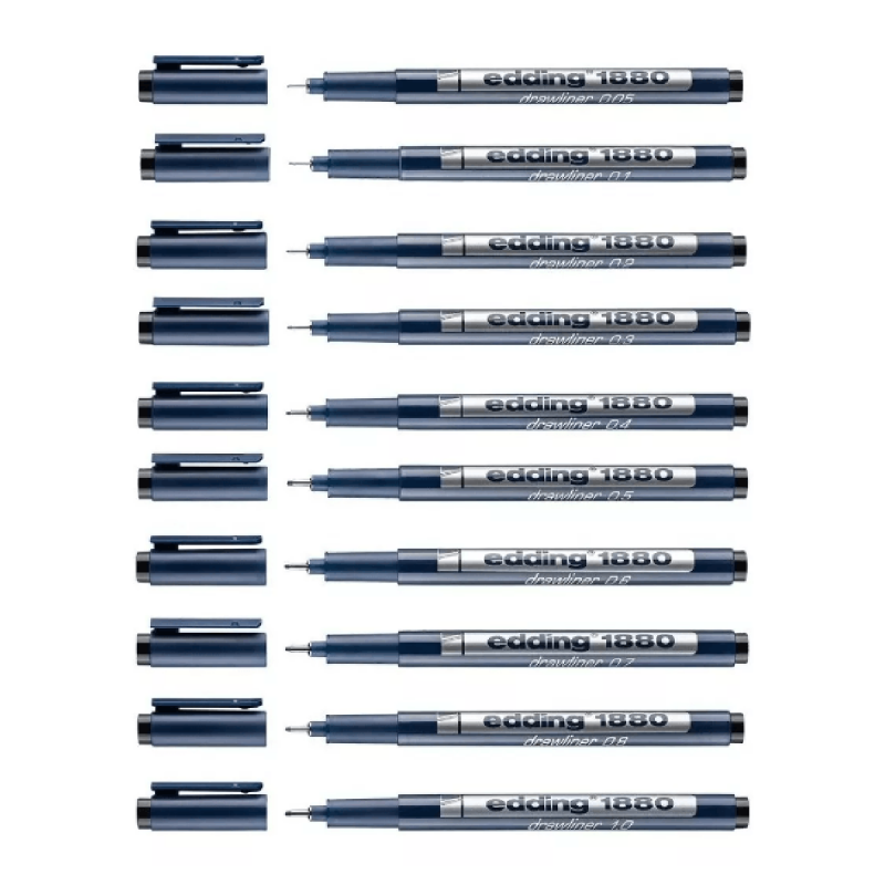 (0341) 387-3329Estílógrafo de precisión para bocetos precisos en papel de color claro. El set incluye anchos de trazo 0,05 / 0,1/ 0,2/ 0,3 / 0,4 / 0,5 / 0,6 / 0,7 / 0,8 / 1,0 mm. La tinta pigmentada es resistente al agua y extremadamente resistente a la luz.