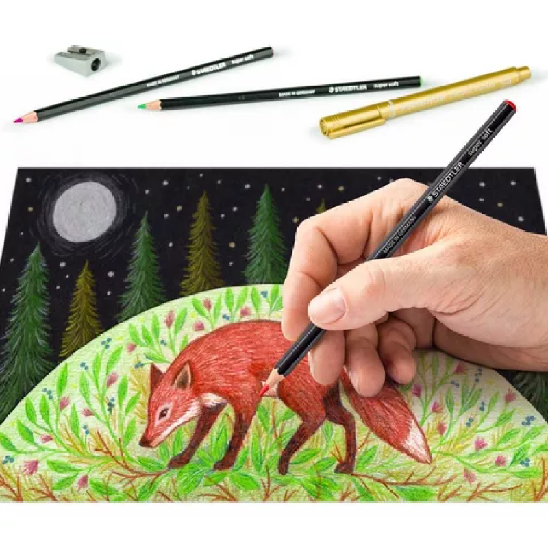 - Contiene: 12 lápices de colores súper suaves en colores surtidos, 4 rotuladores metálicos (azul, verde, dorado, plateado), 1 sacapuntas de plástico
