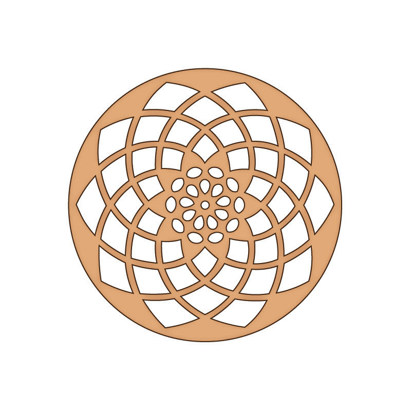 Mandala circular de fibrofácil con corte y grabado láser, en 3 mm de espesor.