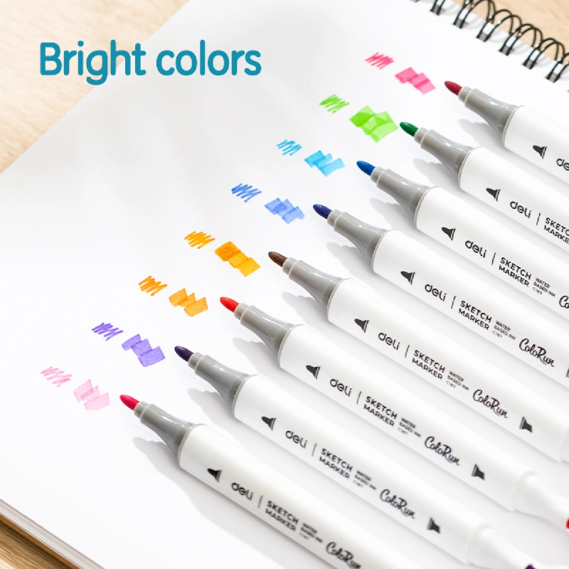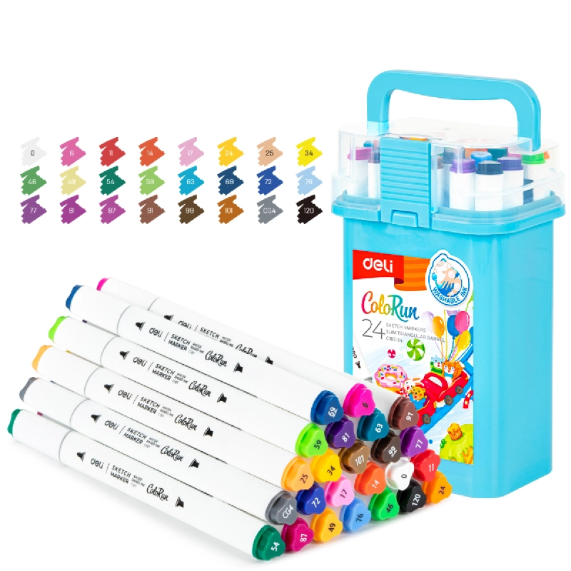 Los marcadores ColoRun Sketch de doble punta (12, 24, 36, 48 y 60 colores) tienen un cuerpo triangular para un agarre cómodo. Un lado tiene una punta ancha de Chesil de 6,2 mm para colorear áreas extensas y el otro lado una punta fina redonda de 1,0 mm para dibujar y delinear. Colores brillantes. Tinta lavable a base de agua de secado rápido. Las puntas están hechas de fibra de alta calidad. Ideales para pintura de estudiantes, dibujo de animación y para colorear en cursos de arte. Los marcadores vienen en un cómodo estuche de plástico con asa, fácil de transportar.