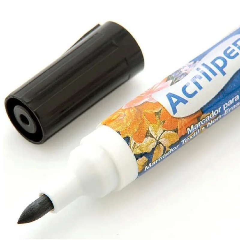 La punta del marcador Acrilpen permite hacer trazos de diferentes espesuras. Usando en la posición vertical, consigues trazos finos, en la posición inclinada, trazos más gruesos.