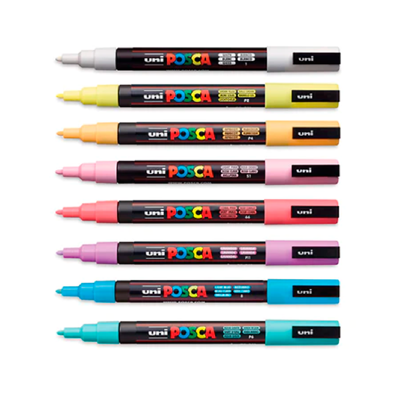 La versátil punta cónica de los marcadores Uni POSCA ofrece una libertad de uso ilimitada y se adapta a todo tipo de creaciones. Disponibles una gran variedad de colores que se pueden mezclar y superponer, con tinta soluble en agua y no tóxica que se seca rápidamente y puede utilizarse en una amplia variedad de superficies. Los marcadores POSCA de pintura a base de agua son adecuados para la mayoría de los proyectos de arte y artesanía en más de 50 superficies, incluyendo madera, vidrio, metal, plástico, cerámica, cuero y más. El secado rápido los hace ideales para trabajos de interior y exterior.