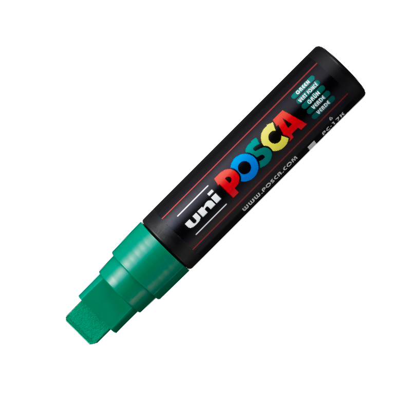 El marcador de pintura de punta de cincel extra ancha uni POSCA contiene tinta de pigmento a base de agua que es resistente a la luz y al agua, y escribirá en casi cualquier superficie. El PC-17K de punta de cincel extra ancha, de 17 mm, es el marcador ideal para obras de arte a gran escala. Su punta de tamaño XL produce una línea fuerte y segura y un color vivo.