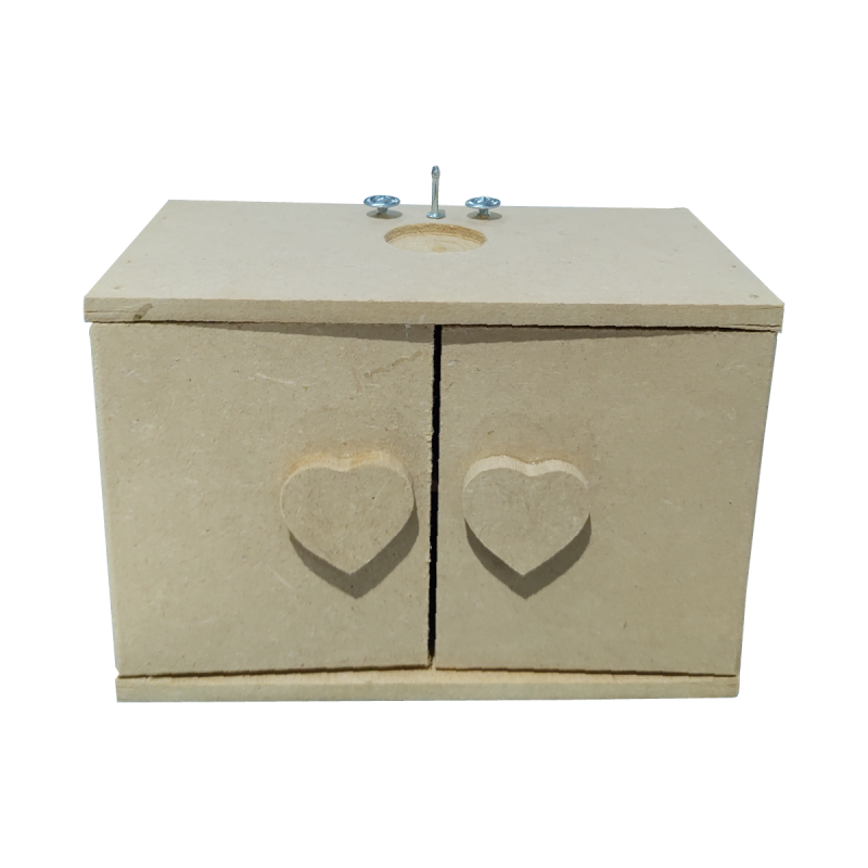 Bajo mesada pequeña para casa de muñecas, perillas y canilla. Dos puertas, una división.