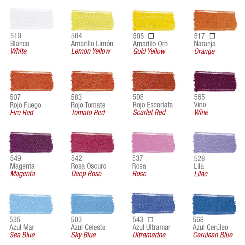 Puede ser aplicada con pincel, esponja o sello de goma en telas de algodón sin goma (no sintéticos).