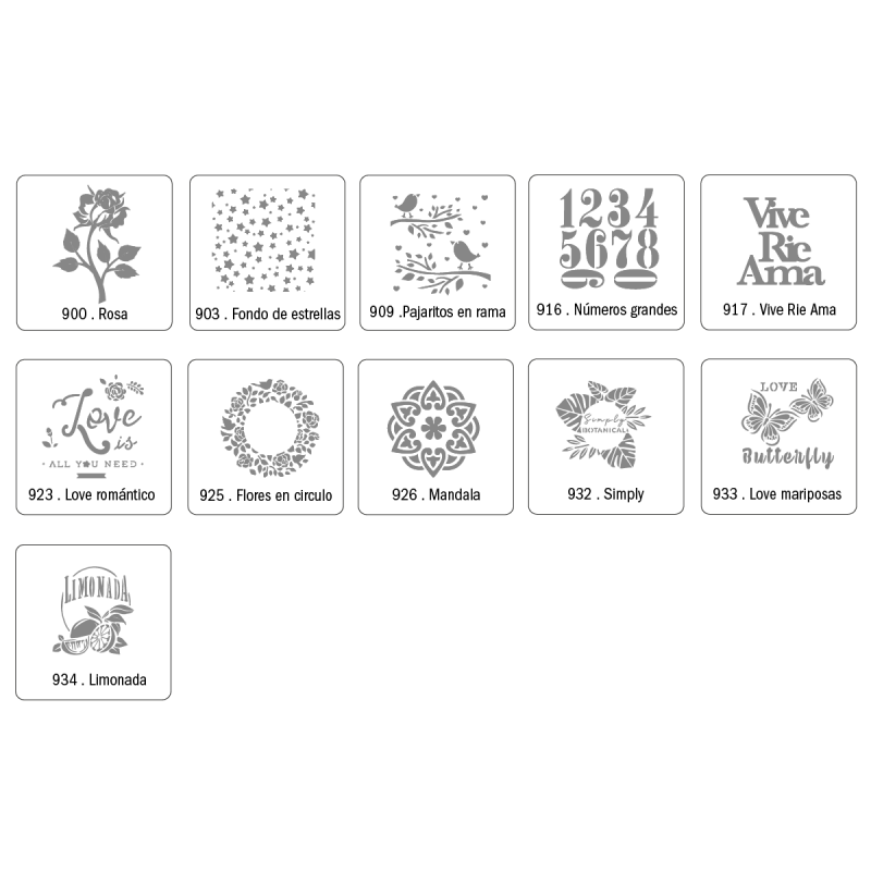 Plantillas confeccionadas con material plástico resistente y flexible. Se limpian con agua o solvente, dependiendo de la pintura utilizada.