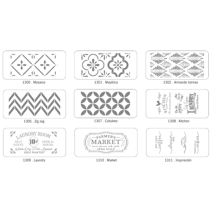 Plantillas confeccionadas con material plástico resistente y flexible. Se limpian con agua o solvente, dependiendo de la pintura utilizada.